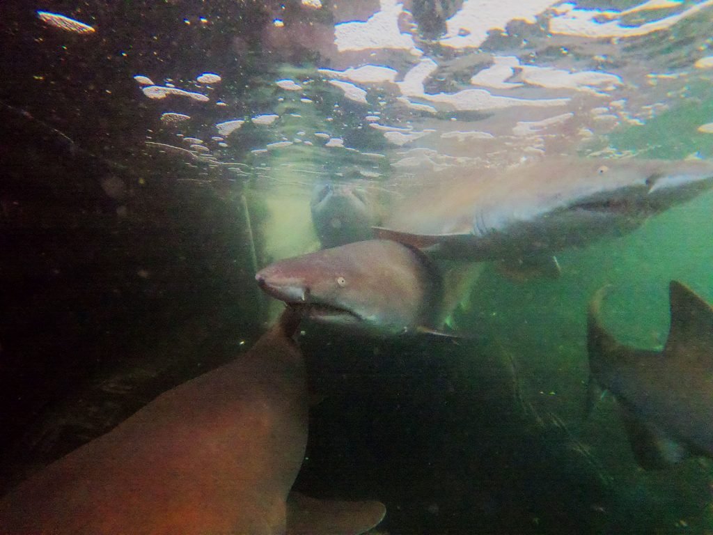 The sand tiger shark (Carcharhinus taurus). Sand tigers generally hunt at night, just above the sea floor in relatively shallow waters. Sand tiger sharks hunt close to shore but also as deep as 200 meters. Sand tiger sharks look ferocious, with a row of tri- cuspid jagged teeth that you can see even when their mouths are closed, but they are generally docile.