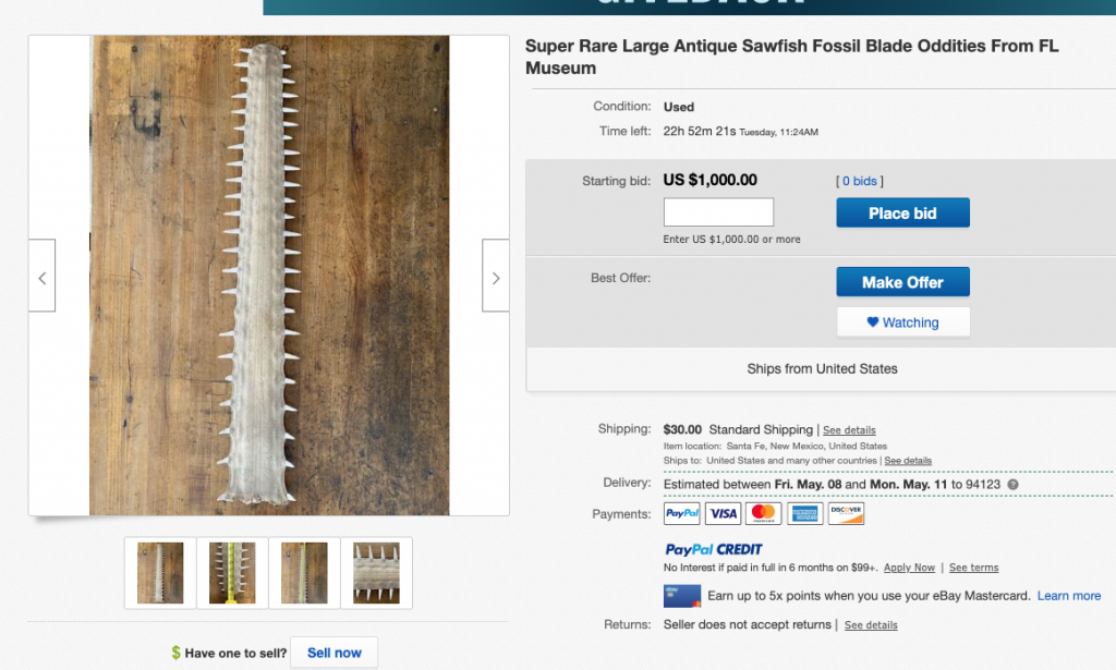 In 2023 sawfish rostra were selling for over $1400.00 and white shark jaws over $5000.00. It appears that eBay is allowing sellers loopholes by calling these rostra “antique” and placing the onus of CITES documentation and permitting onto the buyer, thereby violating their own policy on wildlife.